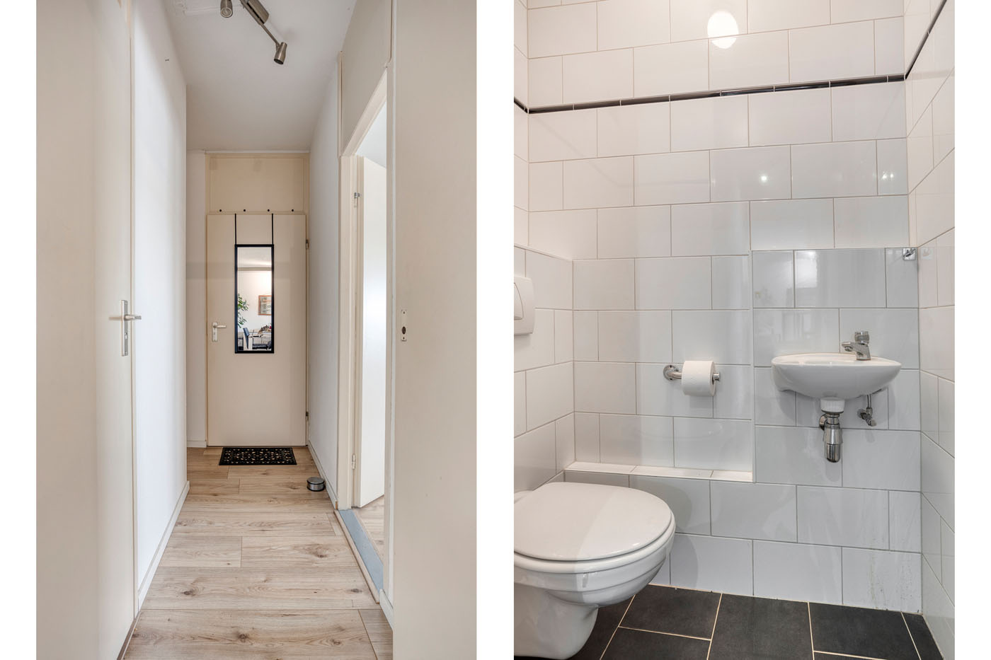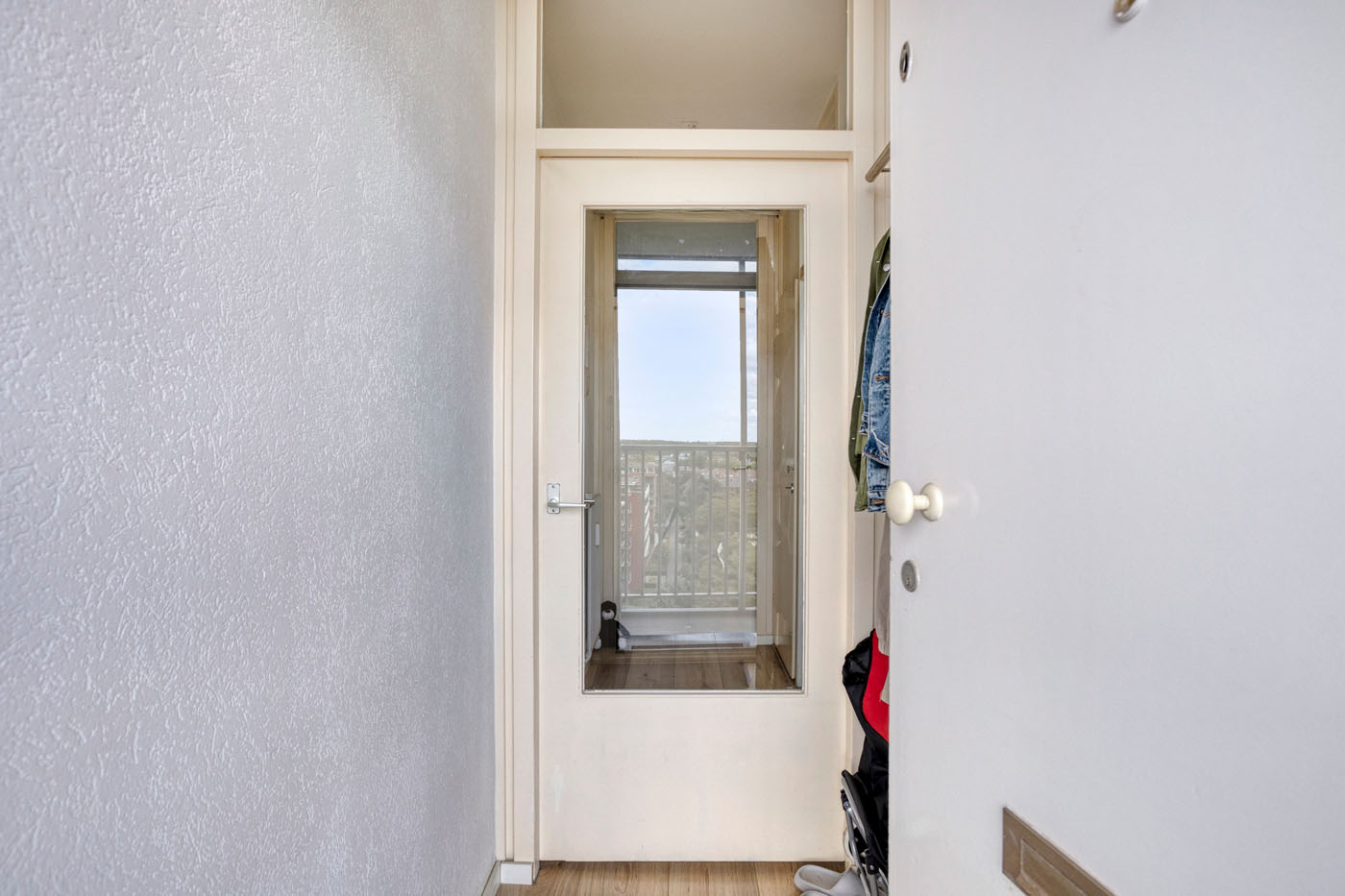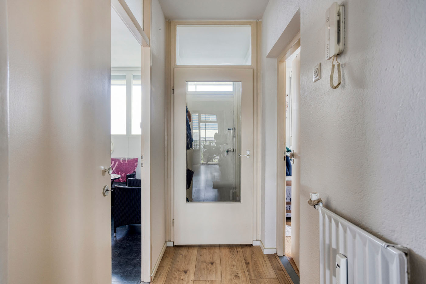 Via de centrale entree met intercom, brievenbussen, algemene fietsenberging, het trappenhuis en liftinstallatie bereik je het appartement. De hal is voorzien van een nette laminaatvloer die doorloopt naar de gang en biedt toegang tot de meterkast, woonkamer en keuken.