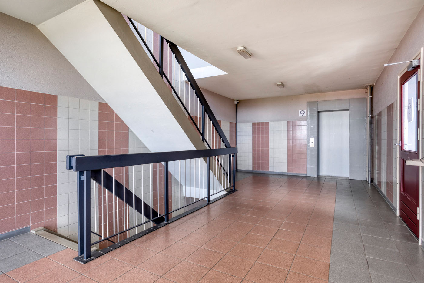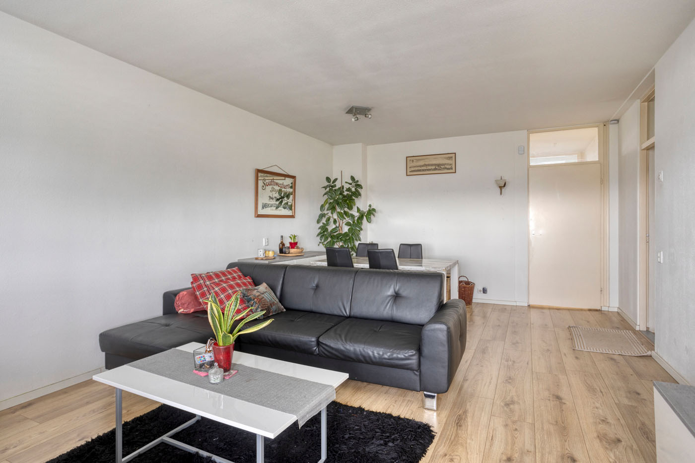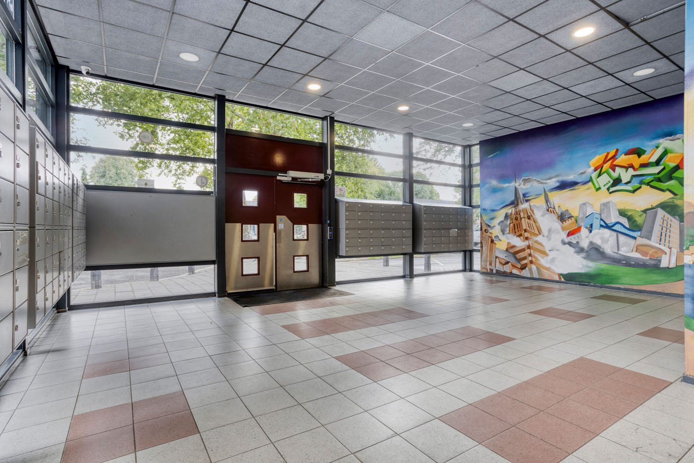 Via de centrale entree met intercom, brievenbussen, algemene fietsenberging, het trappenhuis en liftinstallatie bereik je het appartement. De hal is voorzien van een nette laminaatvloer die doorloopt naar de gang en biedt toegang tot de meterkast, woonkamer en keuken.