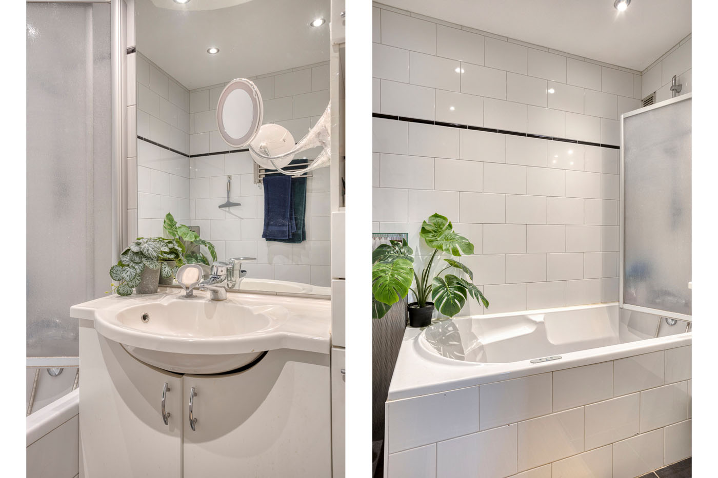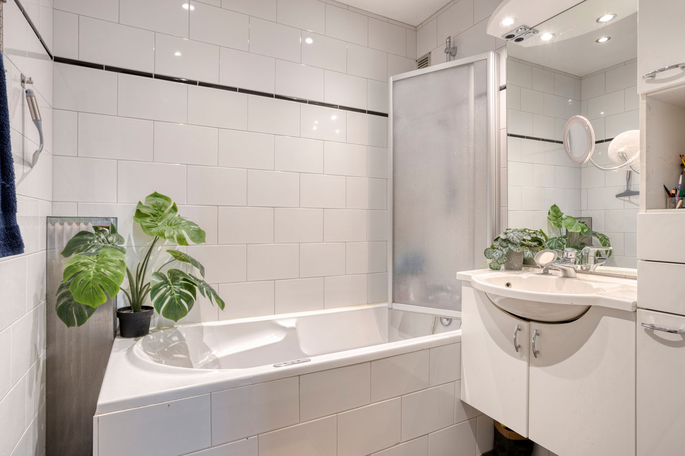 De volledig betegelde badkamer is uitgerust met een ligbad met douchecombinatie, een wastafel met meubel en mechanische ventilatie.