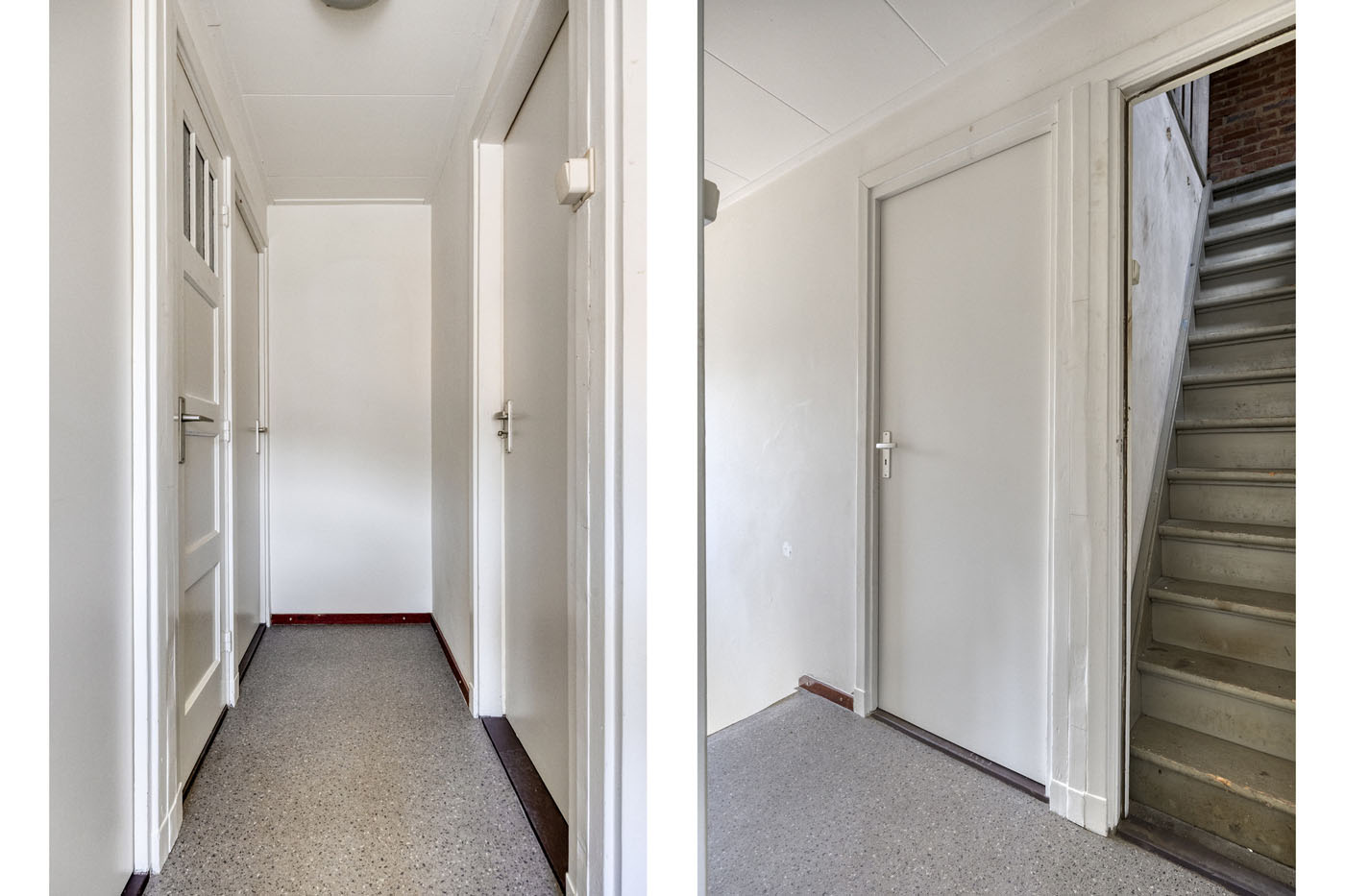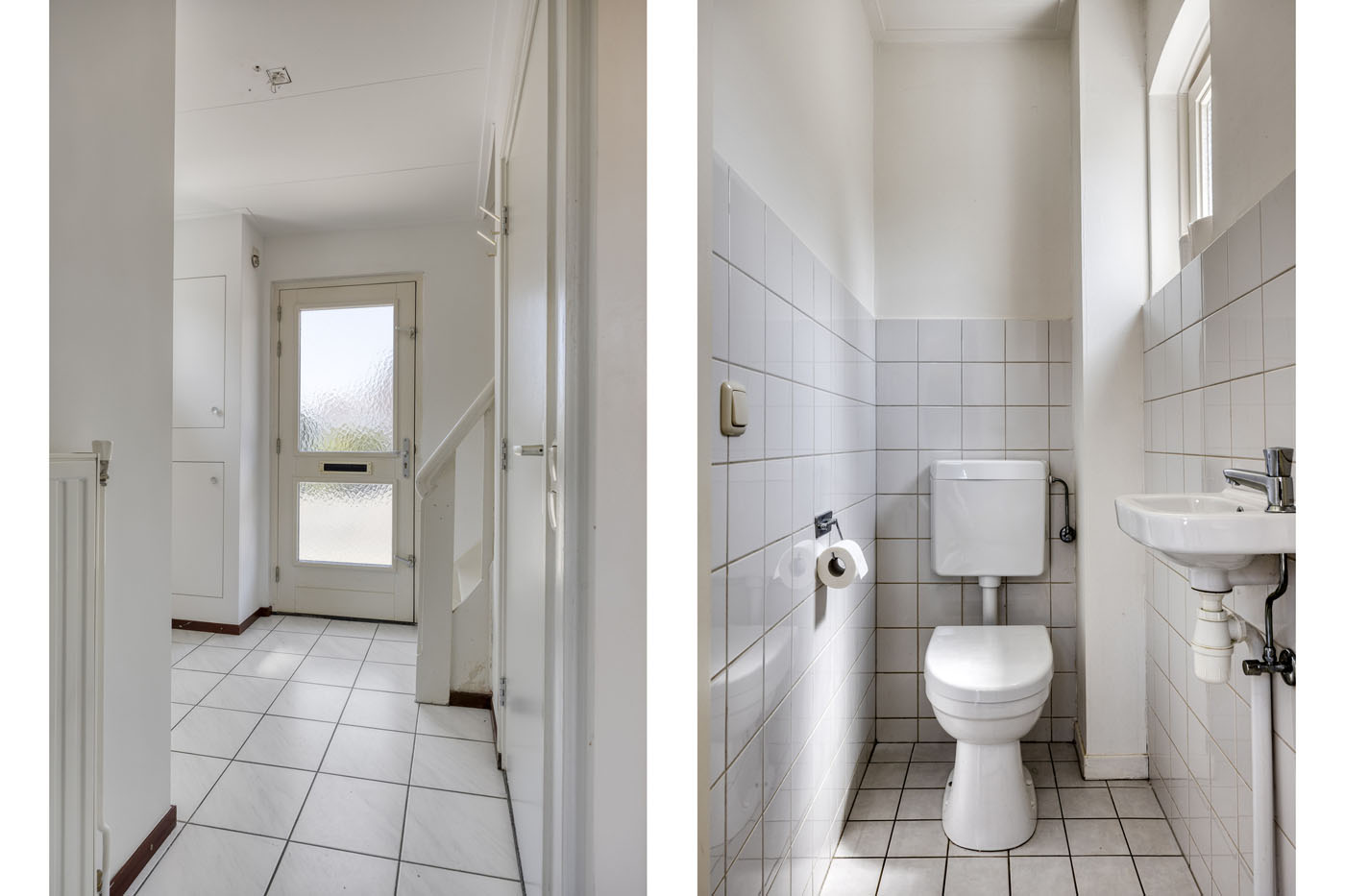 Je komt binnen in een lichte hal met tegelvloer, die toegang geeft tot het toilet, de meterkast, kelder, keuken en woonkamer.