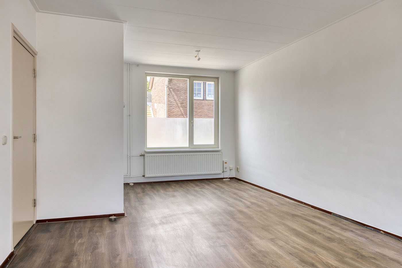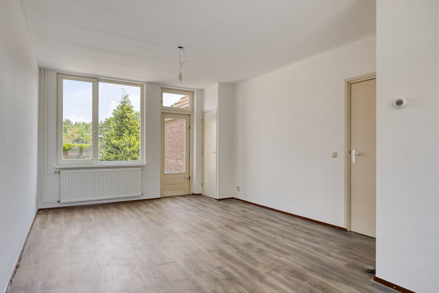 De lichte doorzonwoonkamer is een fijne plek om te ontspannen. Dankzij de grote raampartijen aan zowel de voor- als achterzijde valt er veel daglicht binnen, wat zorgt voor een aangename sfeer. De laminaatvloer en strak afgewerkte wanden vormen een neutrale basis die je gemakkelijk naar eigen smaak kunt inrichten. Via de tuindeur heb je direct toegang tot het terras en de achtertuin – ideaal voor wie graag binnen en buiten met elkaar verbindt. Bovendien biedt de ruimte zich uitstekend voor een aanbouw, zonder dat je veel tuin hoeft in te leveren.