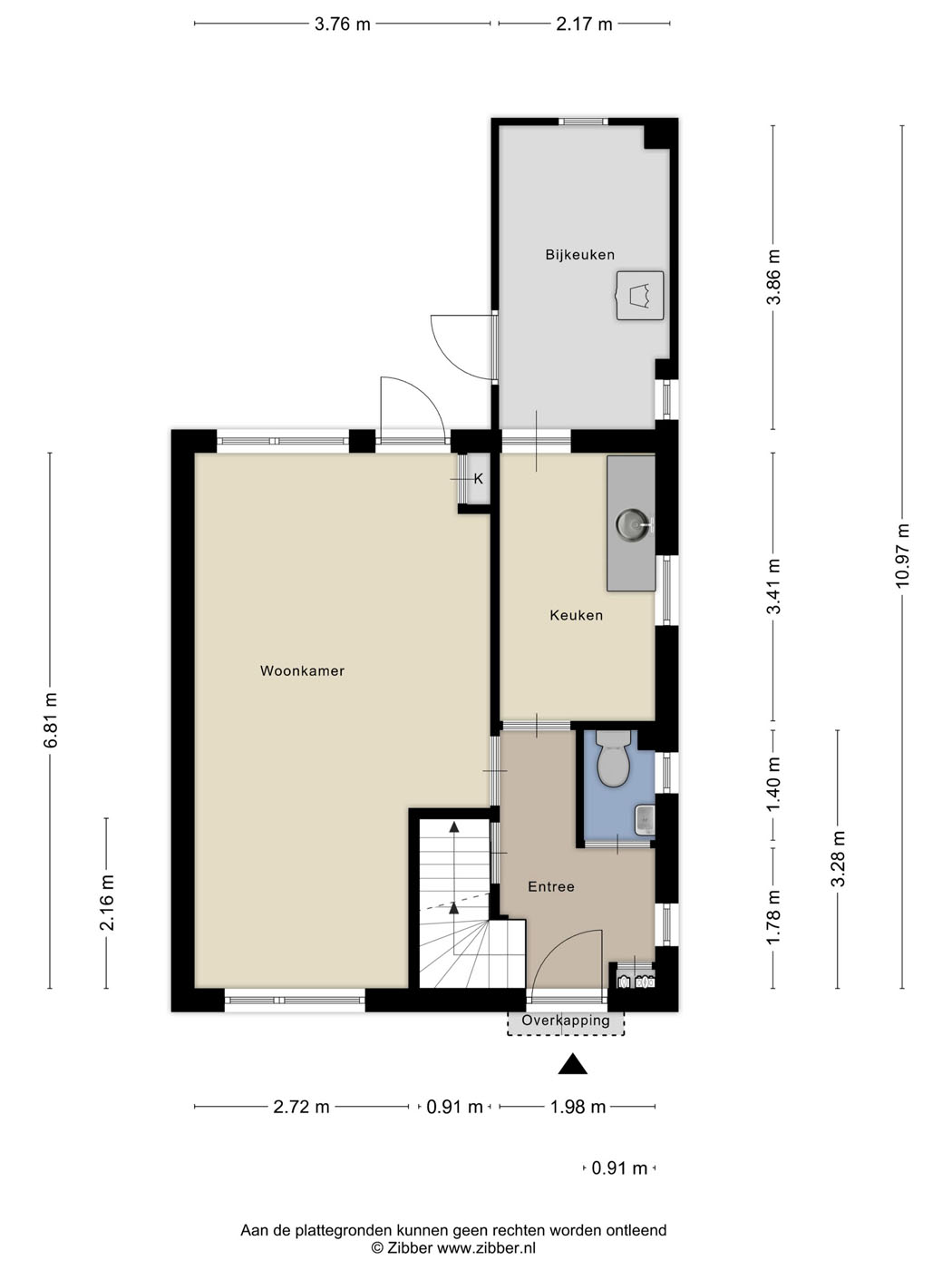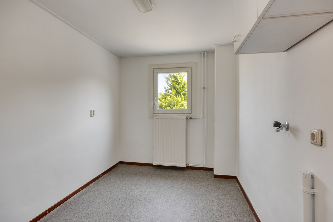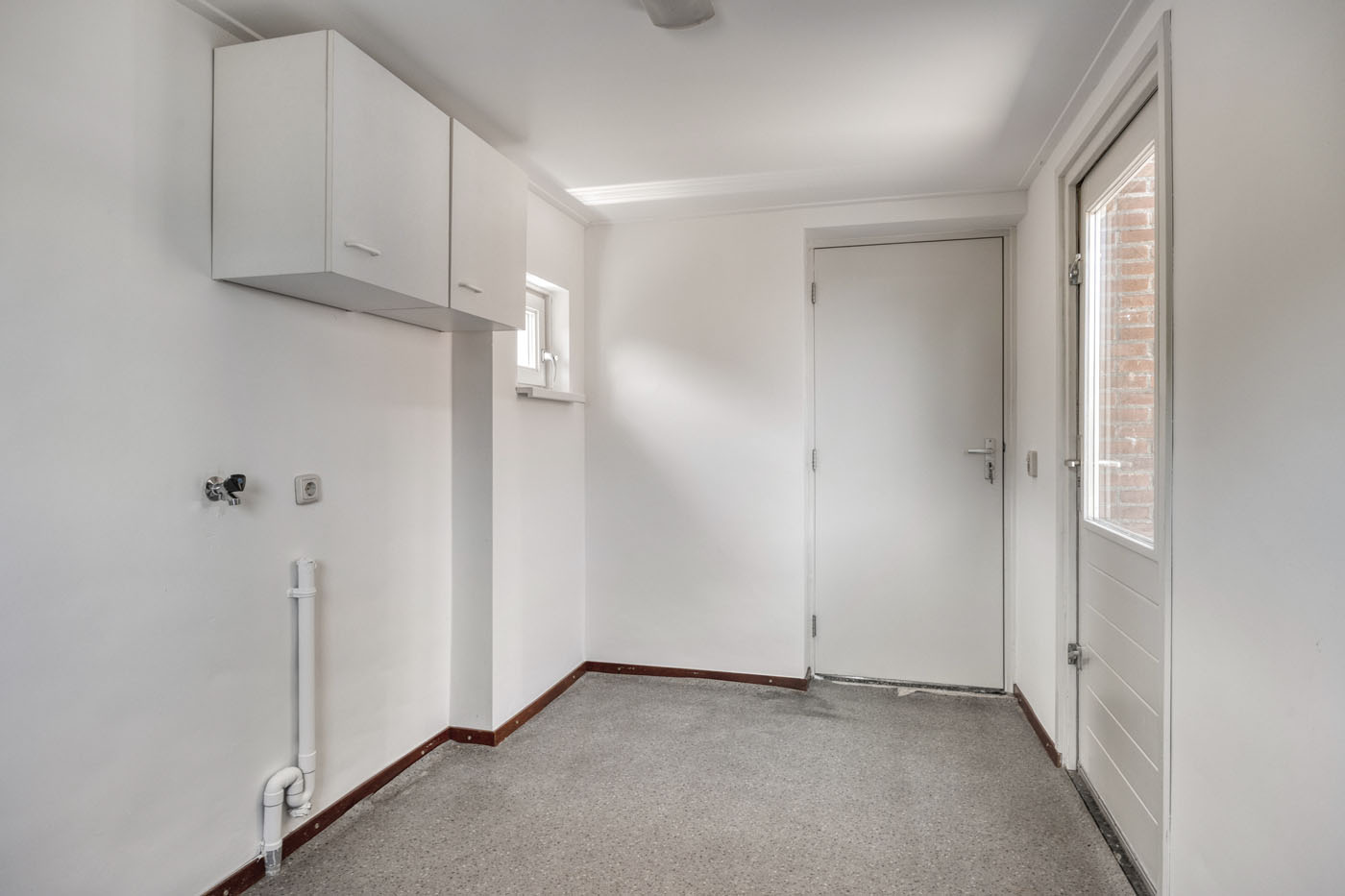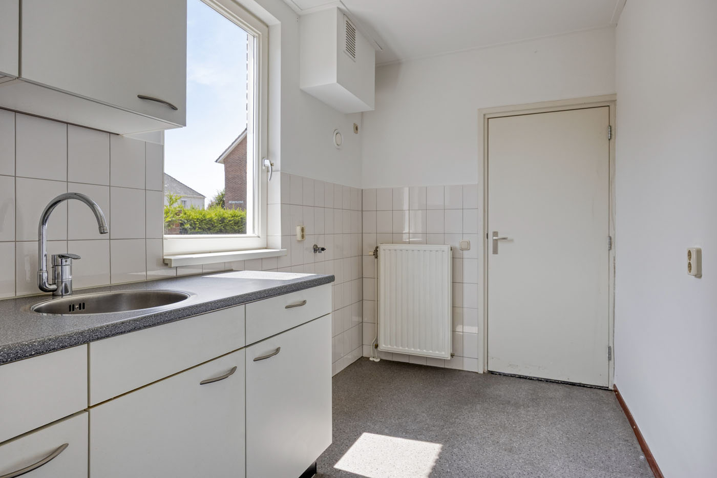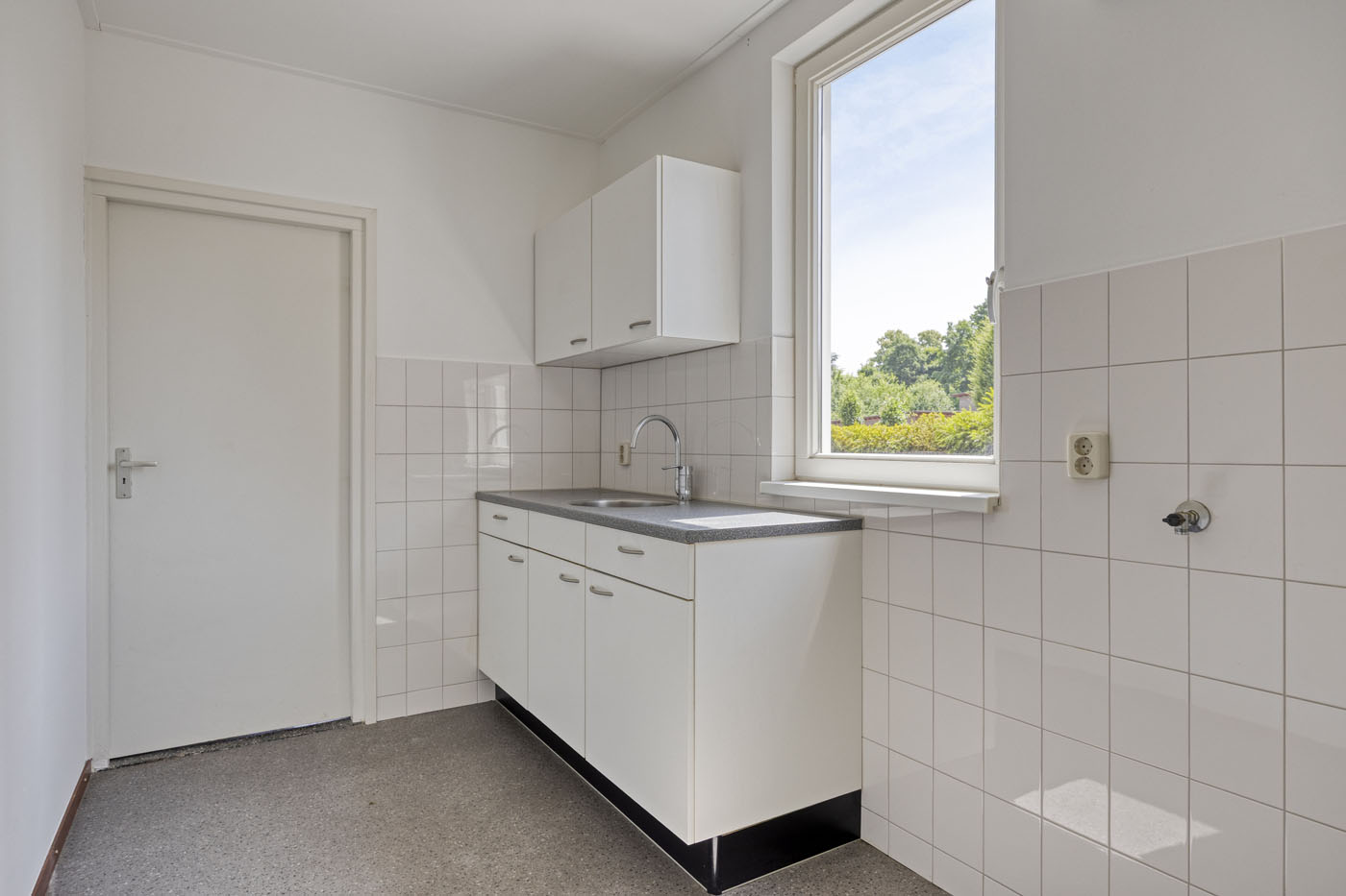 De eenvoudige keuken is voorzien van een aanrecht blok met wasbak en biedt jou als koper de kans om deze geheel naar eigen wens en stijl te moderniseren. Aangrenzend bevindt zich de bijkeuken – een nette ruimte met witgoedaansluitingen en directe toegang tot de tuin.