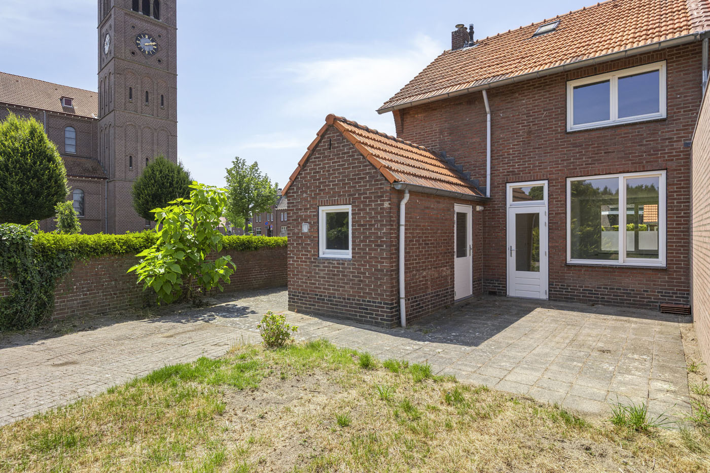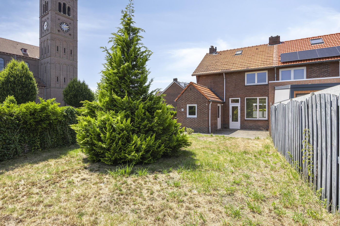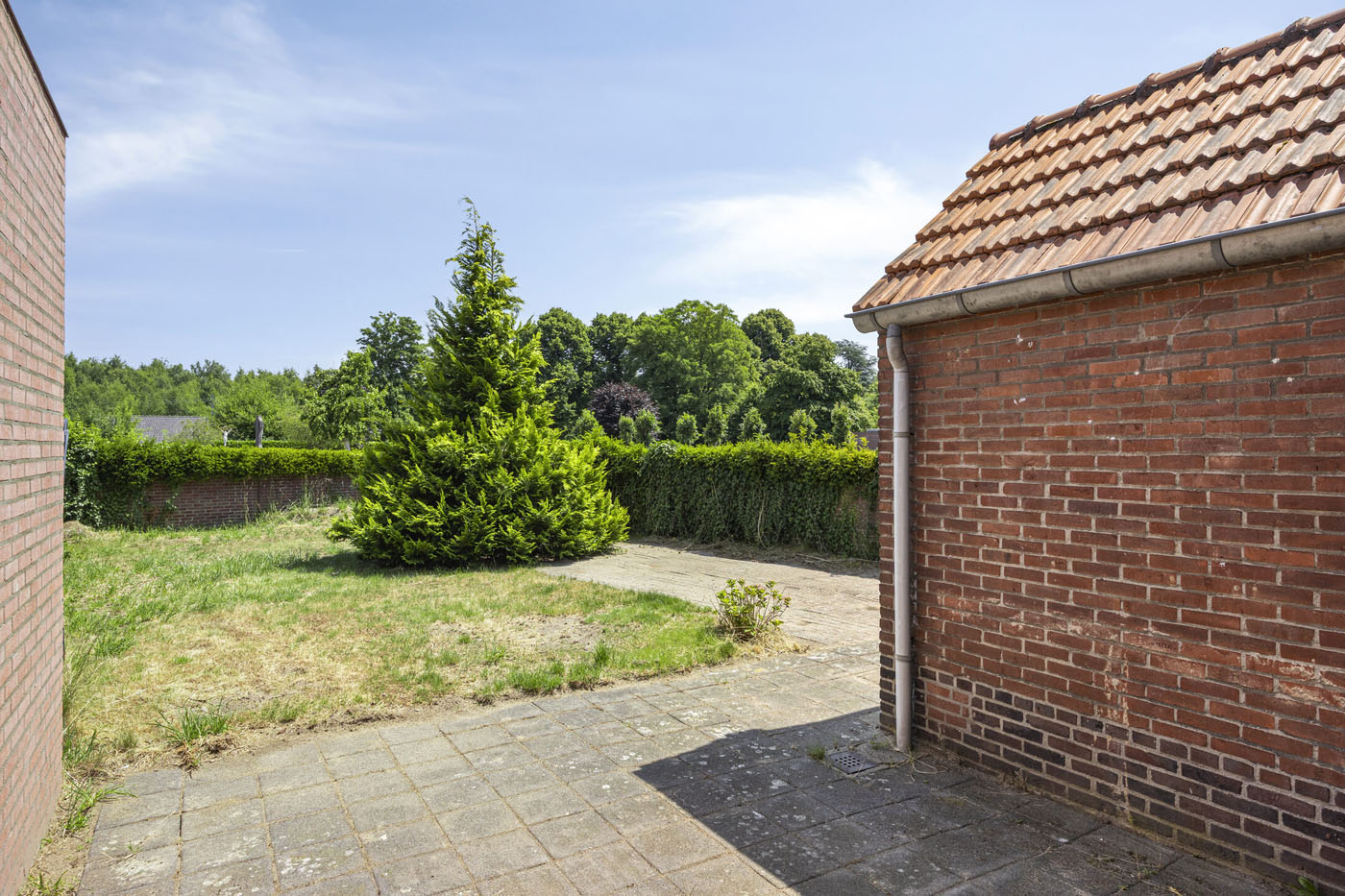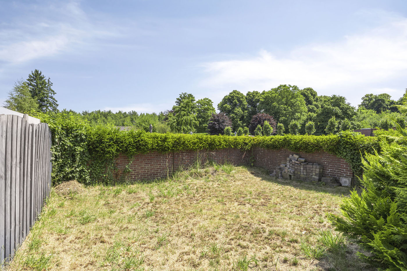 De tuin ligt op het oosten, waardoor je al vroeg op de dag van de zon geniet. Dankzij het ruime gazon blijft er, zelfs bij een eventuele uitbouw, nog voldoende tuin over. De achterom maakt het extra praktisch.