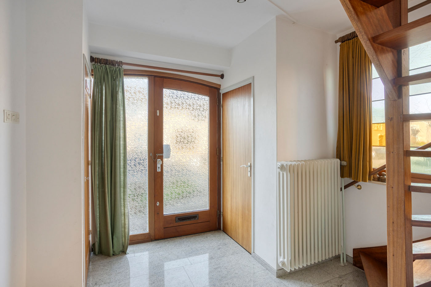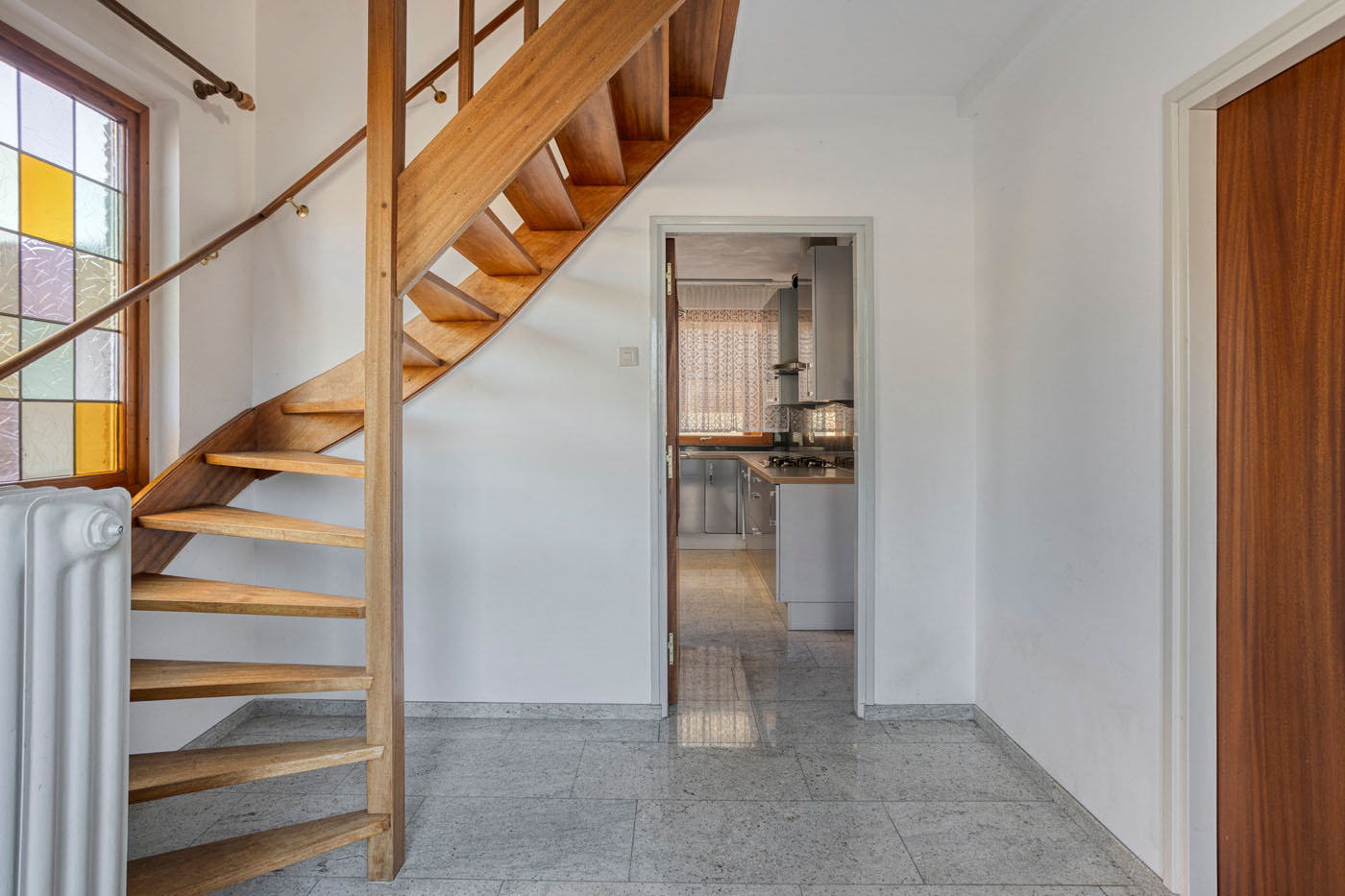 Via de entree betreedt u de lichte hal met natuurstenen vloer en fraaie glas-in-loodramen. Vanuit hier heeft u toegang tot de meterkast, de woonkamer, de keuken en het half betegelde toilet met fontein.