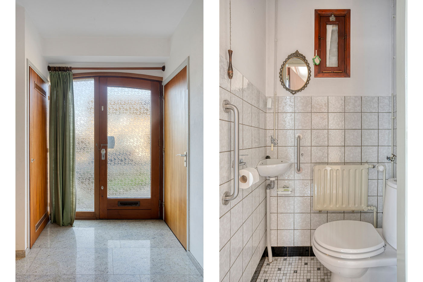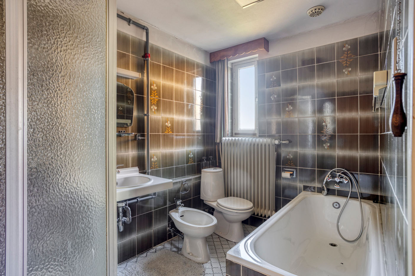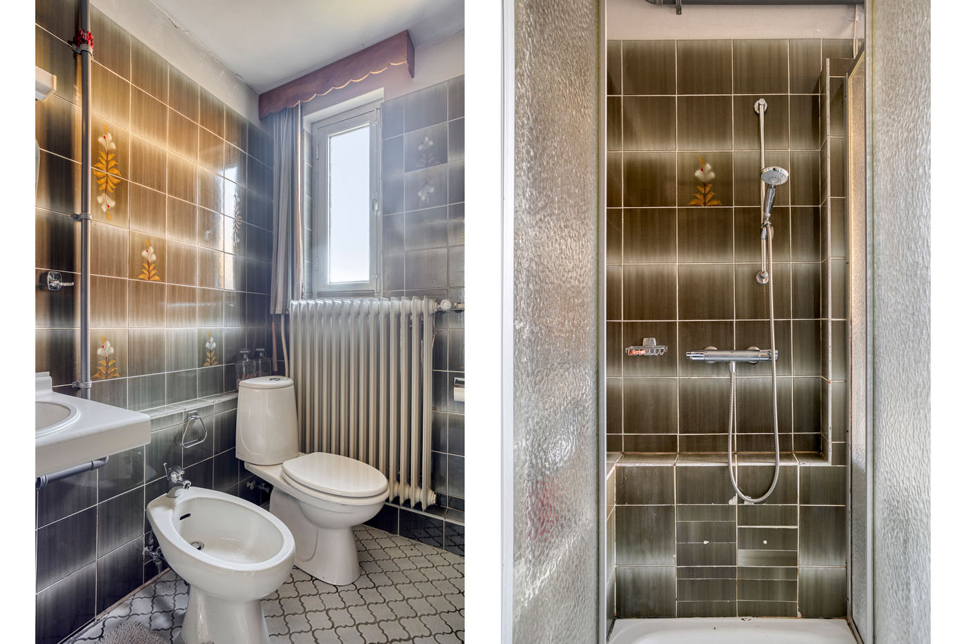 De volledig betegelde badkamer is inmiddels gedateerd, maar beschikt wel over een complete en functionele indeling. De ruimte is uitgerust met een douche, een ligbad, een toilet, een bidet en een wastafel. Dankzij deze royale opzet en de aanwezige voorzieningen biedt de badkamer volop mogelijkheden om na renovatie te worden omgevormd tot een moderne, comfortabele en stijlvolle badkamer die volledig aansluit bij de woonwensen van nu.