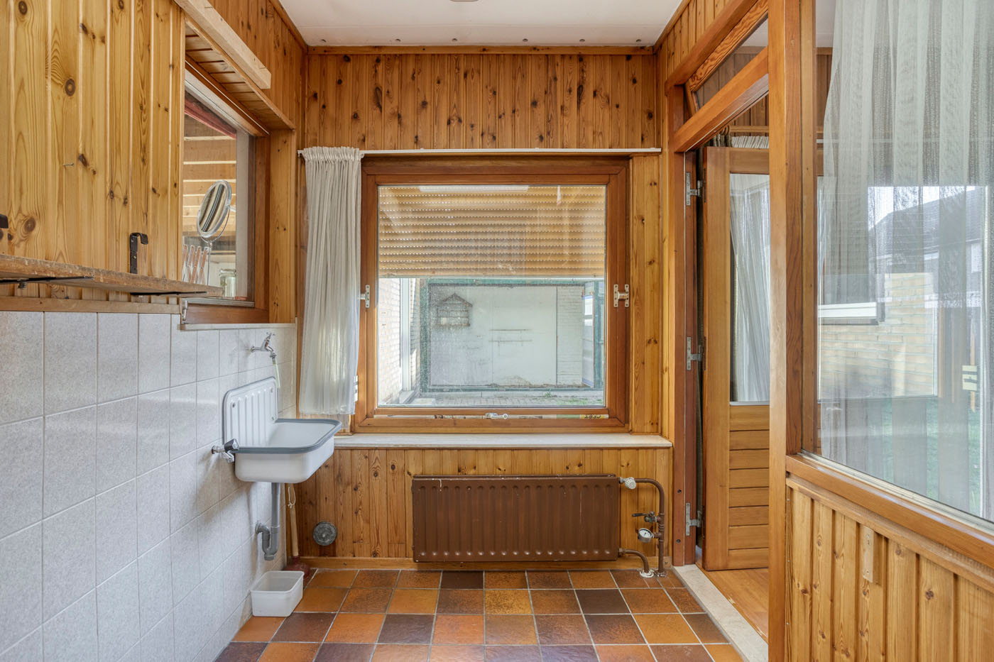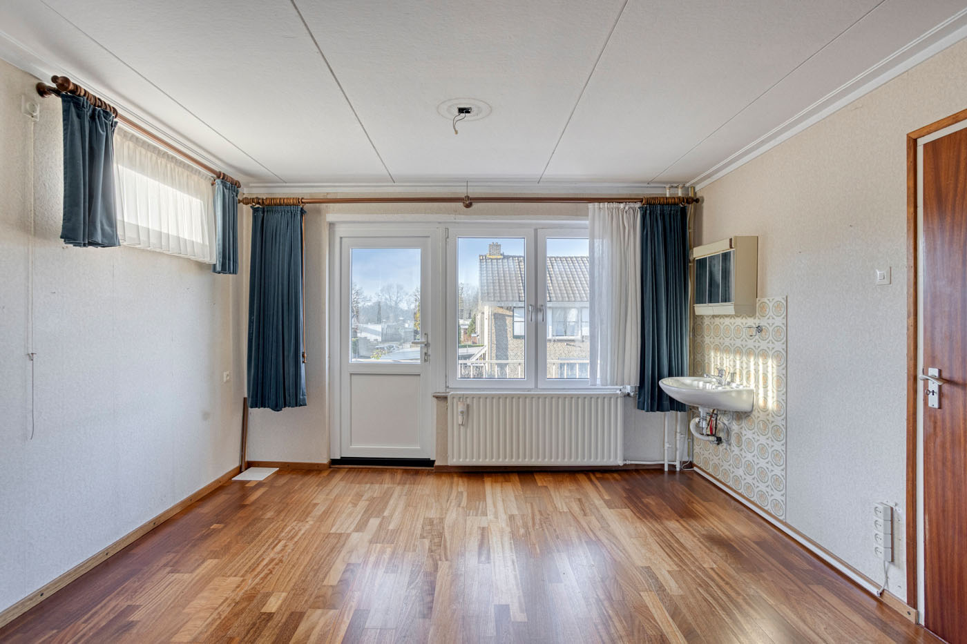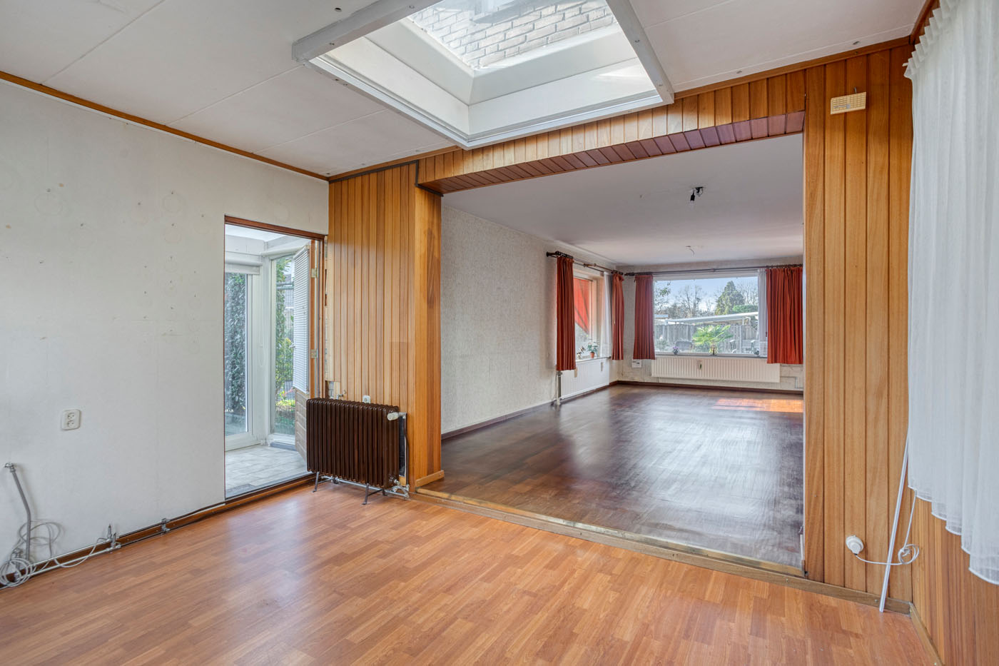 Vanuit de keuken is de doorzonwoonkamer bereikbaar, voorzien van een parketvloer en een prettige lichtinval. Aan de achterzijde is de woning uitgebouwd; deze aanbouw beschikt over een schuifpui en een lichtkoepel. Vanuit de aanbouw bereikt u aan de ene zijde de serre, gelegen aan de straatzijde, en aan de andere zijde een extra kamer die momenteel dienstdoet als bijkeuken en is voorzien van een wasbak.