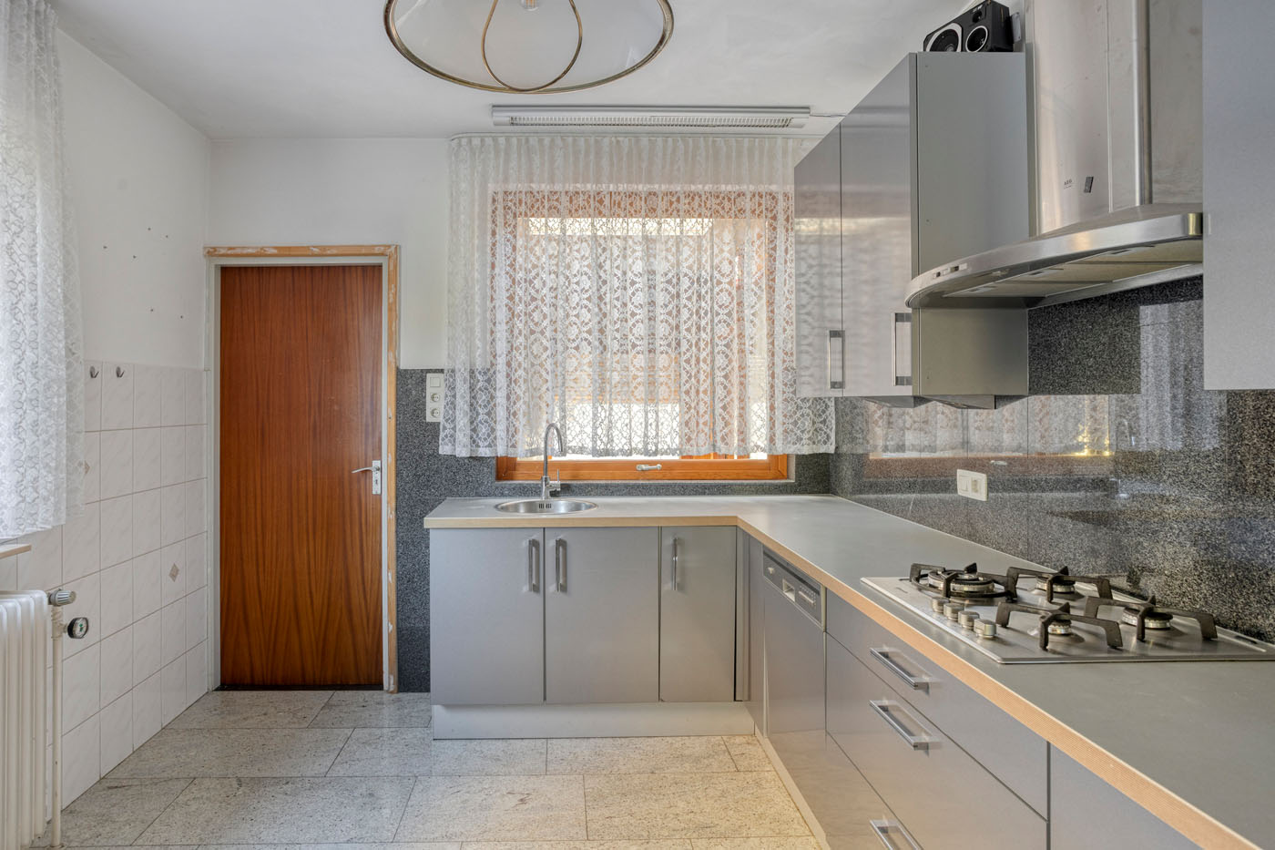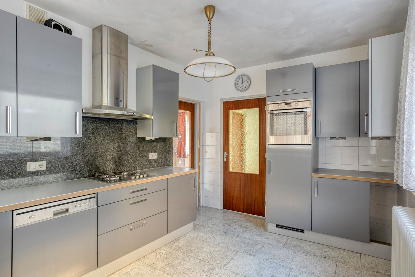 De keuken is zowel via de hal als via de woonkamer bereikbaar. Deze is netjes uitgevoerd en voorzien van dezelfde natuurstenen vloer als de entree. De keuken beschikt over diverse inbouwapparatuur, waaronder een vaatwasser, 4-pits gaskookplaat, RVS afzuigkap, oven en koelkast. Vanuit de keuken heeft u inpandig toegang tot de garage.