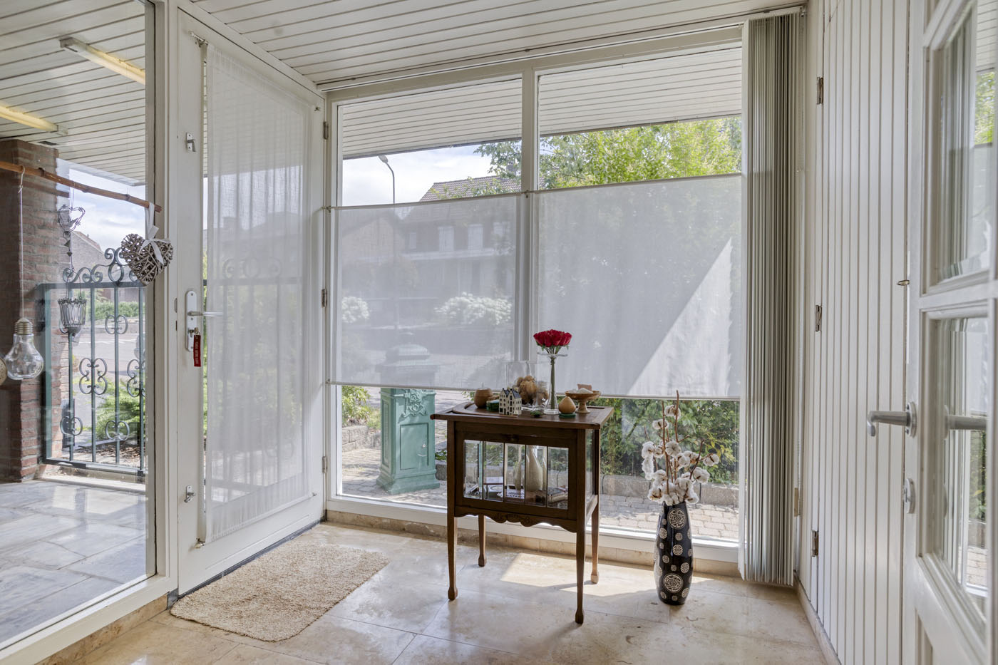Bij binnenkomst betreed je de lichte en royale entree van de woning, die voorheen dienstdeed als bankkantoor. De natuurstenen vloer geeft direct een gevoel van kwaliteit en duurzaamheid. Dankzij de houten kozijnen met dubbel glas valt er volop daglicht binnen, wat bijdraagt aan de aangename sfeer. De wanden zijn afgewerkt met schrootjes, waarachter de meterkast keurig is weggewerkt. Vanuit de entree is er een directe doorgang naar de woonkamer.