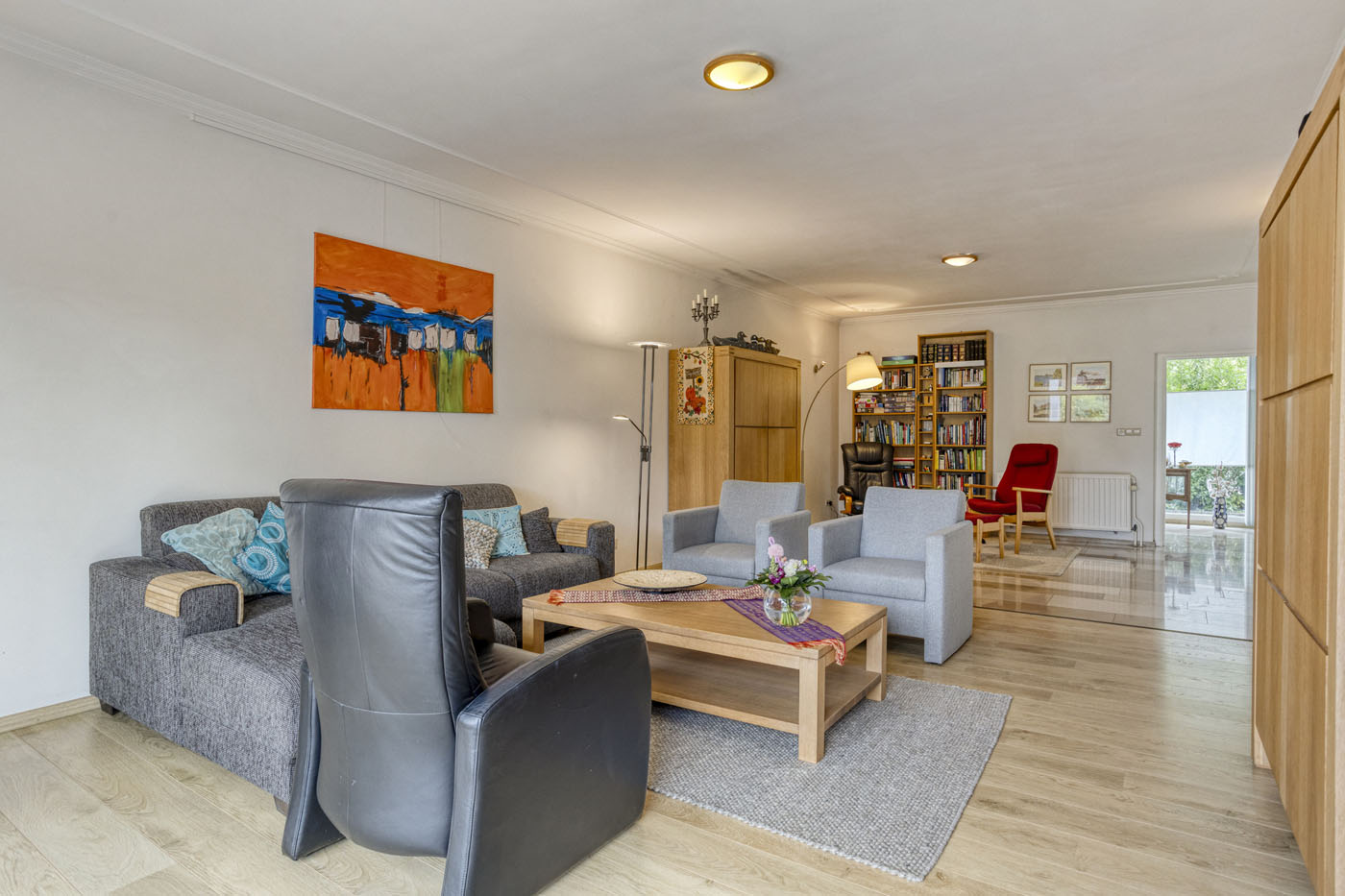 De woonkamer is opgedeeld in een voor- en achtergedeelte, elk met een eigen karakter. Aan de voorzijde bevindt zich een sfeervolle leeshoek met een tegelvloer. Het achterste gedeelte is ingericht als comfortabele zithoek en voorzien van een laminaatvloer. Een schuifpui met elektrisch bedienbaar rolluik zorgt voor een prettige lichtinval en biedt uitzicht op de achtergelegen tuin.