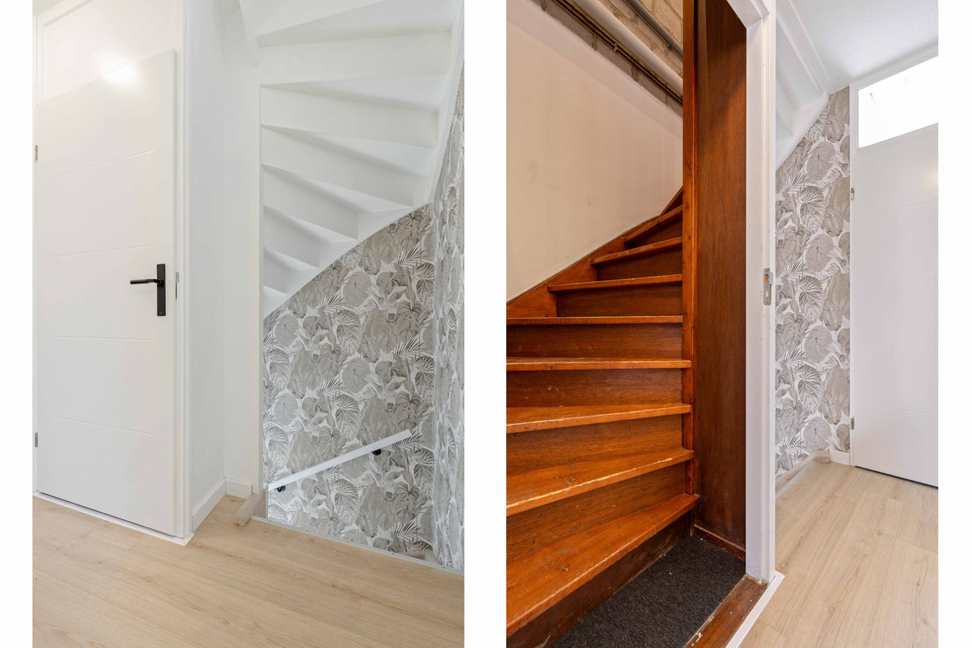 Via de entree kom je in de hal, die direct een verzorgde en moderne indruk geeft dankzij de stijlvolle houten lattenwand en de decoratieve tegeltjeslookvloer. Deze loopt naadloos over in een houtlook PVC vloer, welke is doorgelegd over de gehele begane grond. Vanuit de hal heb je toegang tot het volledig betegelde toilet met fontein en de moderne meterkast.