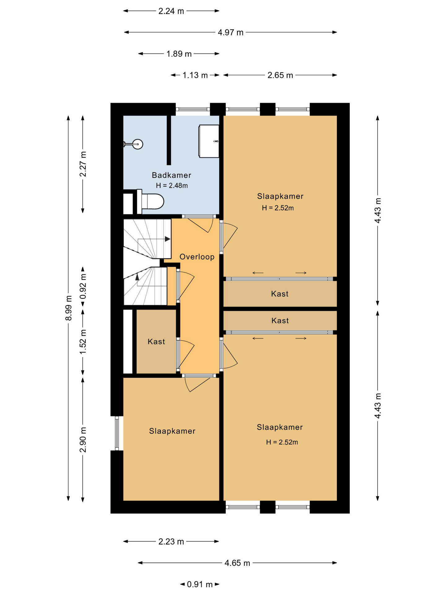 Via de gestoffeerde trap bereik je de eerste verdieping. De overloop en drie slaapkamers zijn netjes afgewerkt met een laminaatvloer. Alle slaapkamers zijn, net als de rest van de woning, voorzien van rolluiken. De twee grootste slaapkamers beschikken over praktische ingebouwde kasten met schuifdeuren. De derde slaapkamer is momenteel ingericht als kleedkamer.