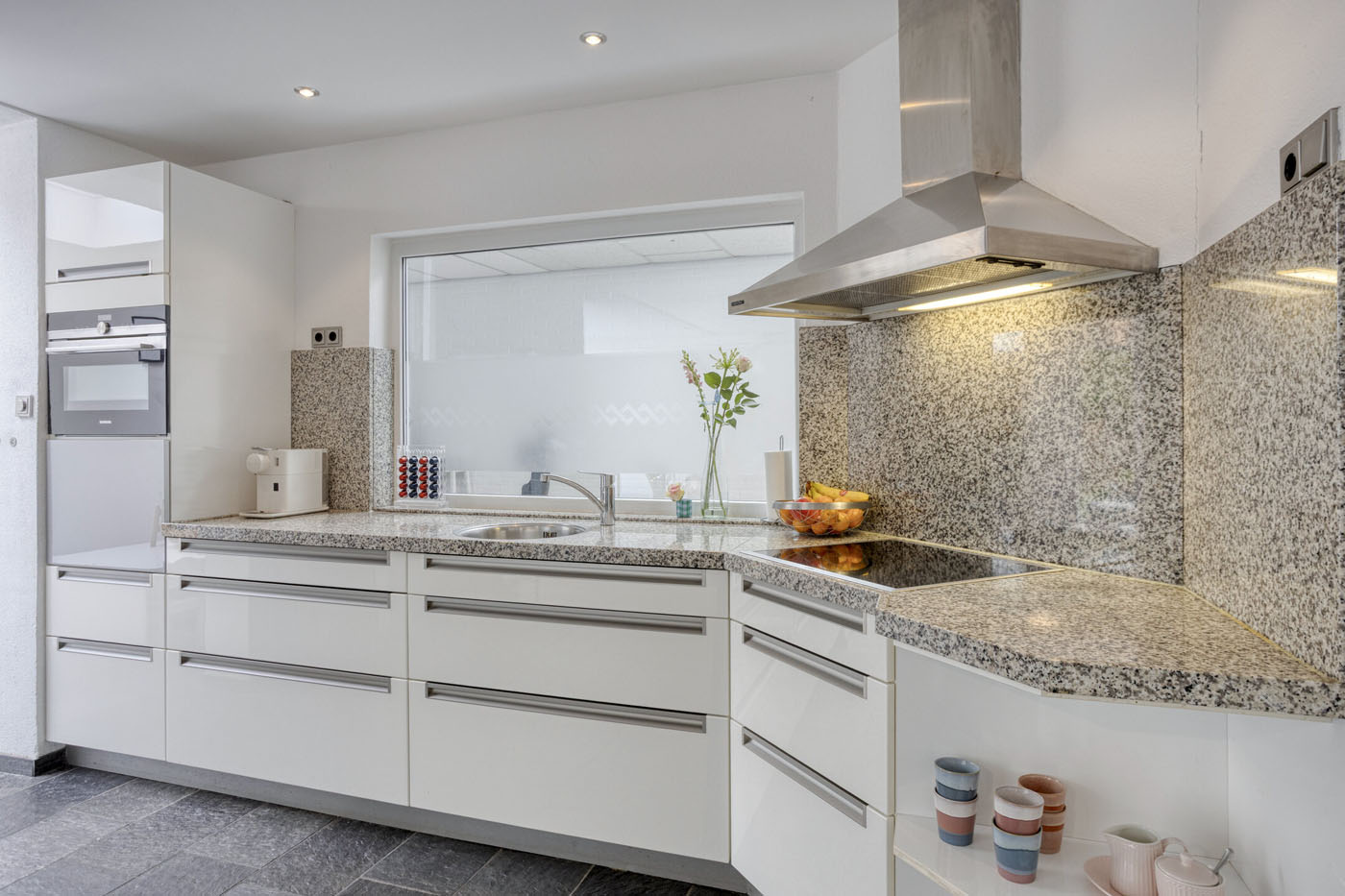 Centraal in de leefruimte bevindt zich de ruime open keuken, uitgevoerd in hoogglans wit en voorzien van een granieten werkblad en achterwand. De keuken beschikt over diverse inbouwapparatuur, waaronder een combi-oven en een 4-pits inductiekookplaat met RVS afzuigkap. Dankzij de royale opberg- en werkruimte is dit een fantastische plek voor kookliefhebbers.